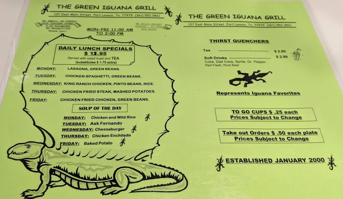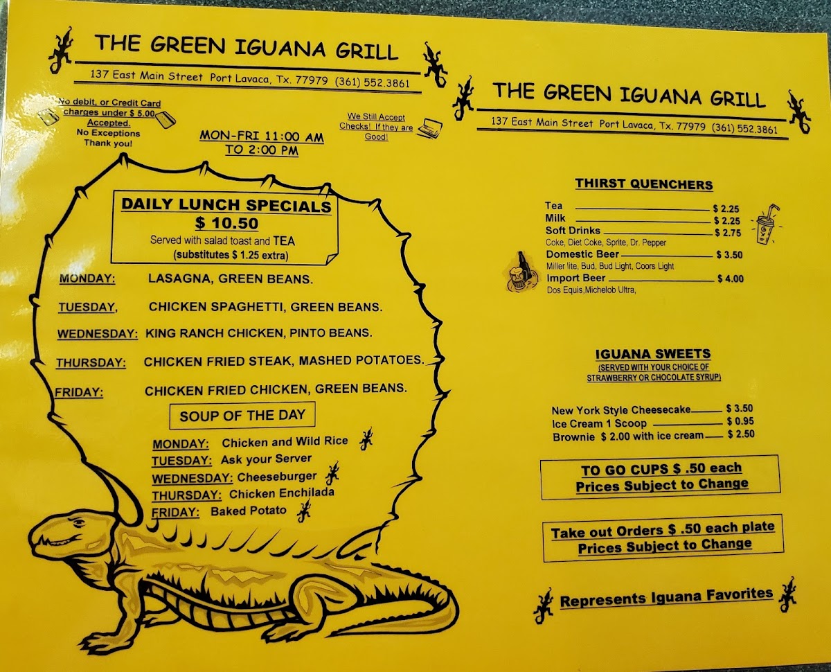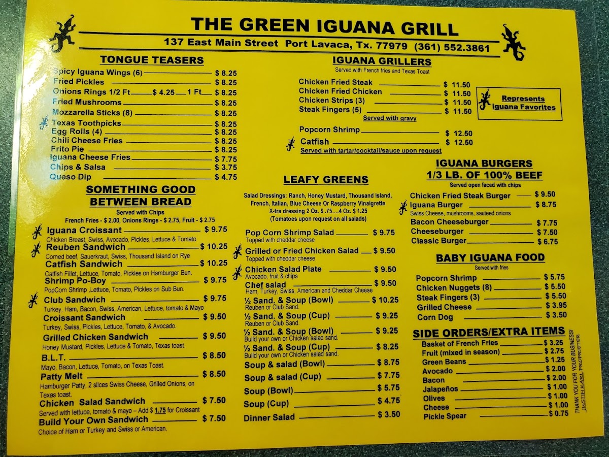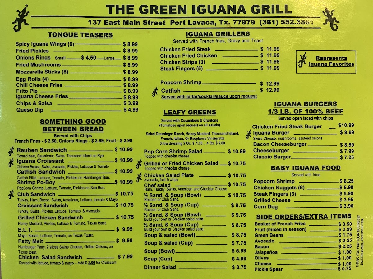If you're craving something fresh and flavorful, the Green Iguana Grill Menu is sure to hit the spot. Located in the heart of Port Lavaca, Texas, this spot offers a variety of dishes that combine bold flavors with fresh ingredients. Whether you're in the mood for sizzling fajitas, a juicy burger, or a seafood delight, there's something here for everyone. The laid-back atmosphere makes it the perfect place for a casual meal with friends or family. You can always expect friendly service, and each dish is made with care, ensuring a delicious experience every time. Be sure to check out their specialty drinks too - they're the perfect complement to any meal. Whether you're a local or just passing through, the Green Iguana Grill is a must-visit for anyone looking to enjoy great food and good times in Port Lavaca.