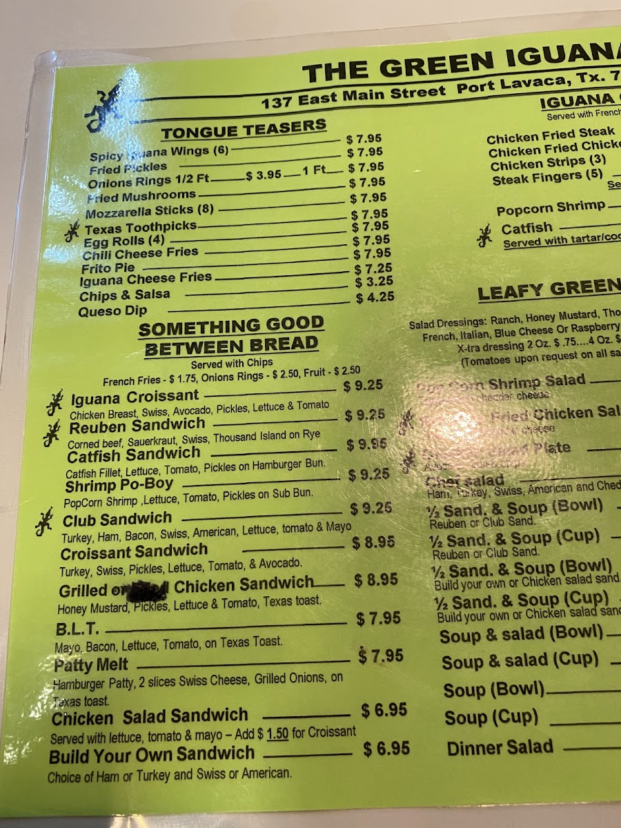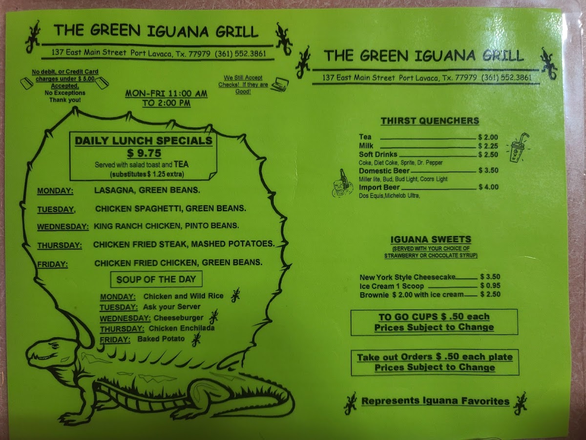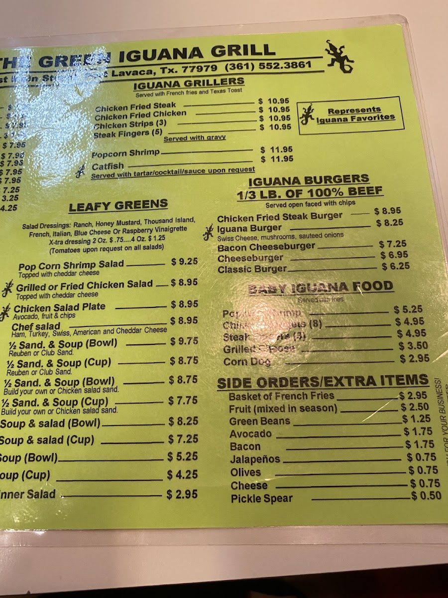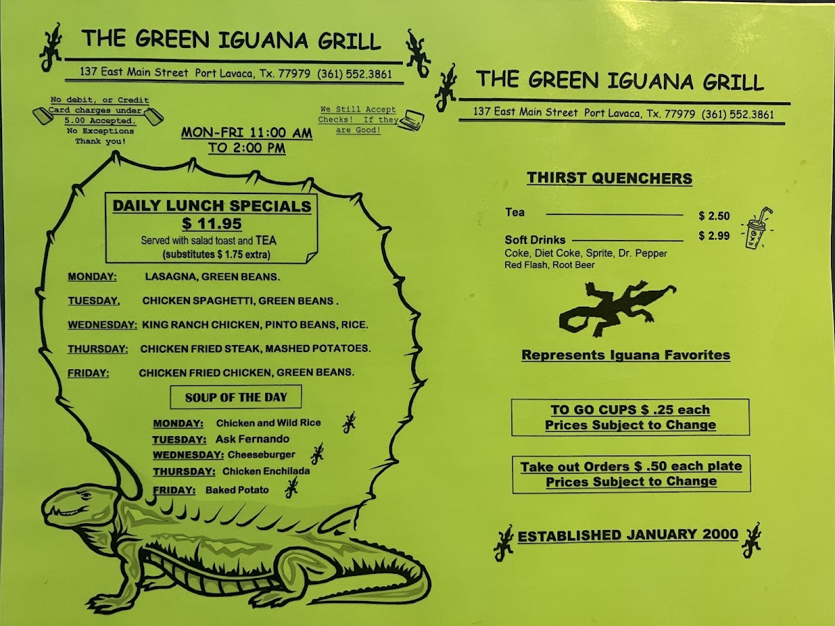 If you're craving something fresh and flavorful, the Green Iguana Grill Menu is sure to hit the spot. Located in the heart of Port Lavaca, Texas, this spot offers a variety of dishes that combine bold flavors with fresh ingredients. Whether you're in the mood for sizzling fajitas, a juicy burger, or a seafood delight, there's something here for everyone. The laid-back atmosphere makes it the perfect place for a casual meal with friends or family. You can always expect friendly service, and each dish is made with care, ensuring a delicious experience every time. Be sure to check out their specialty drinks too - they're the perfect complement to any meal. Whether you're a local or just passing through, the Green Iguana Grill is a must-visit for anyone looking to enjoy great food and good times in Port Lavaca.